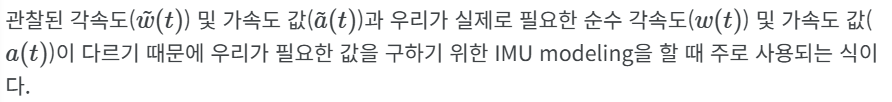 IMU를 활용한 SLAM 논문을 보다보면, Notation은 조금씩 다르지만 아래와 같은 수식을 많이 관찰 할 수 있다.