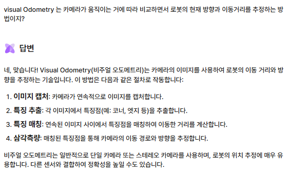 - 단안 카메라 경우 보다 정확한 위치 추정 능력