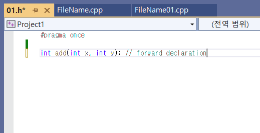 compile은 위에서 아래로 순차적으로 진행 하므로 main() 함수 아래에 선언된 함수가 있다면 다음과 같이 main() 함수 위에 Forward declaration을 해주어야 한다.
