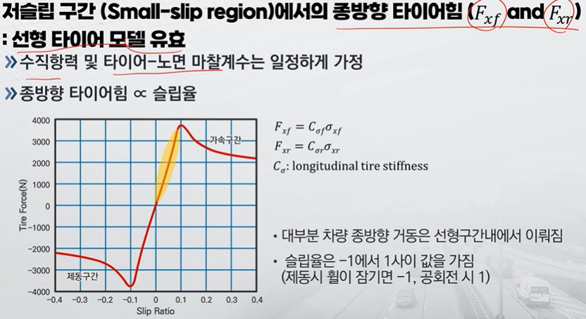 - 저슬립 구간 ( Small-slip region )에서의 종방향 타이어힘( Fxf and Fxr ) : 선형 타이어 모델 유효
