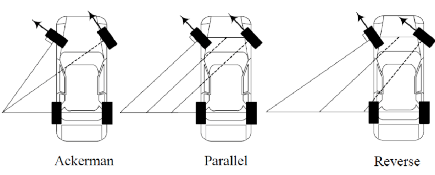 에커만 조향 시스템은 앞 바퀴가 회전하여 방향을 전환하는 방식이다. 이 설계는 차체가 회전 중심을 기준으로 회전하도록 하여, 바퀴가 같은 원호를 따라 움직인다.