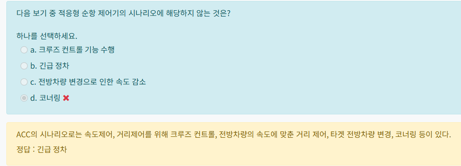 적응형 순항 제어기( ACC )는 속도제어, 거리제어를 위해 크루즈 컨트롤( Cruise Control ), 일정한 속도로 주행할 수 있도록 도와주는 기능이다.