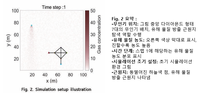 - 제안된 알고리즘 : 강도 센서( 농도, 방사선량 등 )가 탑재된 다수의 무인기를 이용하여 유해 물질 누출 근원지를 빠르고 정확하게 추정하는 알고리즘을 제시