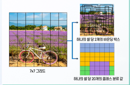 - YOLO의 원리 : 주어진 입력을 여러 개의 그리드 셀로 나누고 미리 설정된 숫자만큼의 바운딩 박스를 그림