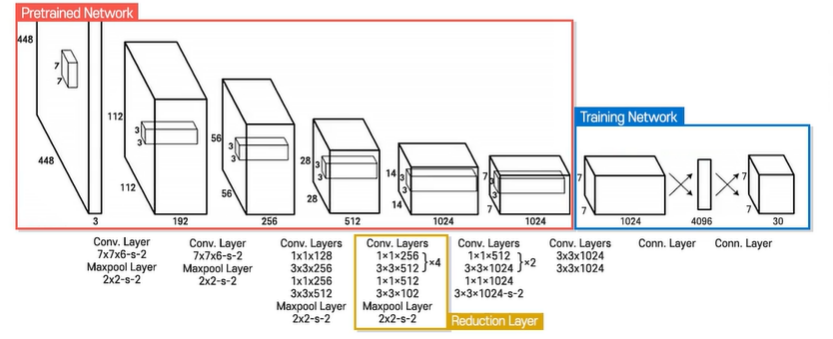 - YOLO는 구글넷을 이용하여 ImageNet의 1000개의 클래스 데이터셋을 사전 학습한 결과를 Fine-Tuning한 신경망을 포함하고 있음
