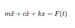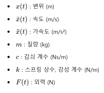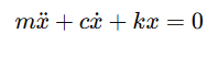 질량 mm, 감쇠 계수 cc, 스프링 상수 kk를 가지는 1-DOF 선형 시스템의 운동 방정식은 다음과 같습니다: