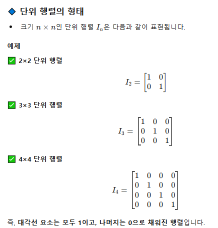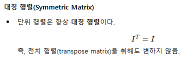 대각선 요소는 모두 1이고 나머지는 0으로 채워진 행렬을 Identity Matrix, 단위행렬이라고 한다.