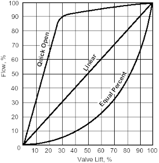 - 플러그의 이동 거리와 유량이 직선 비례 관계.