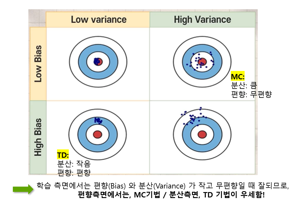 - 반면, 다음 상태의 추정된 가치를 기반으로 보상을 업데이트하므로 약간의 편향이 발생 가능함