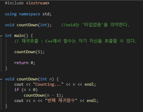 C++에서는 함수가 자기 자신을 호출이 가능하다. 이것을 '재귀 호출'이라고 한다.
