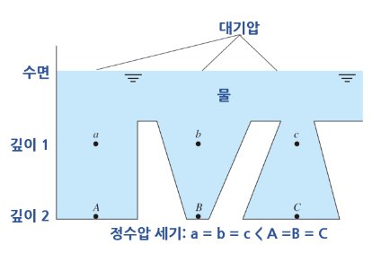 정지된 비압축성 유체( 밀도가 일정한 유체 )내의 압력은 깊이에 따라 선형적으로 변한다.