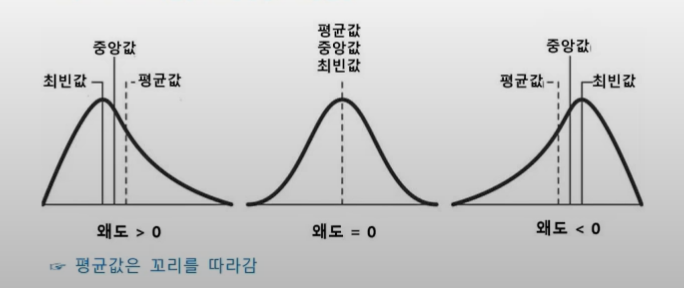 - 왜도 > 0 : 최빈값 < 중앙값 < 평균값