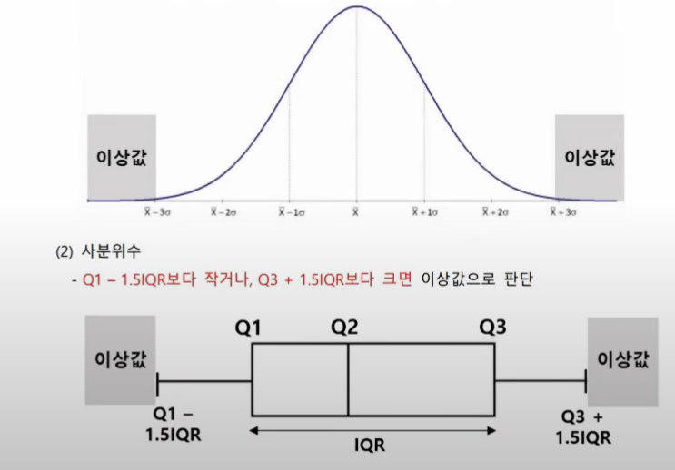 - 평균으로부터 표준편차의 3배 넘어가는 데이터는 이상값으로 판단
