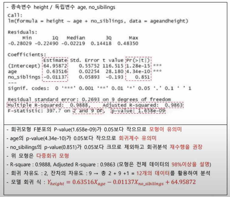 3) 모형이 통계적으로 유의미한가 : 모형에 대한 F통계랑, p-value