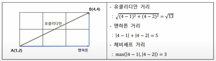 - 체비셰프 거리 : 변수 거리 차 중 최댓값