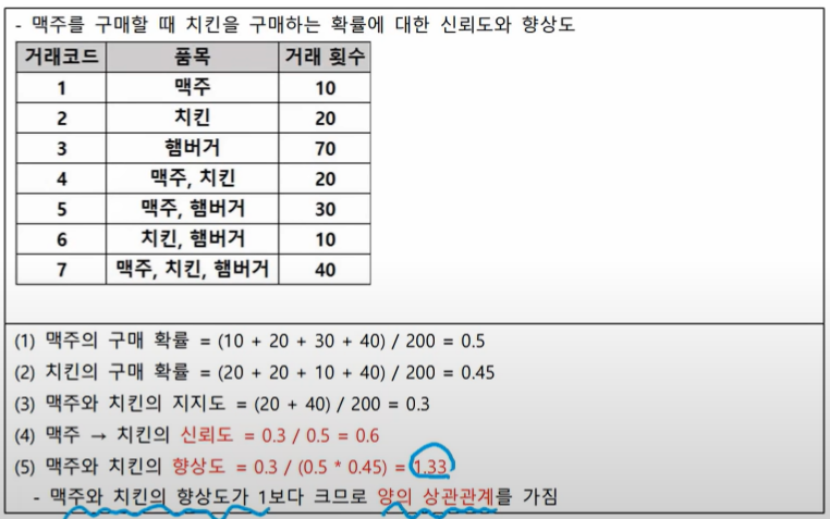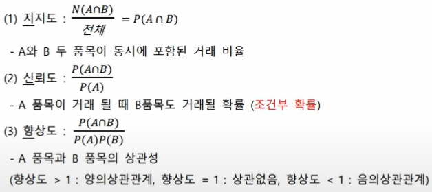 - 항목들간의 조건-결과로 이루어지는 패턴을 발견하는 기법 ( 장바구니 분석 )