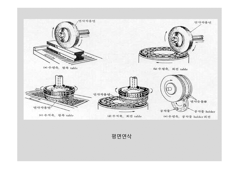 - 연삭공정, 재료 제거 메커니즘, 그리고 연삭재들의 형태와 결합제가 연삭 숫돌에서의 역할에 대해 설명
