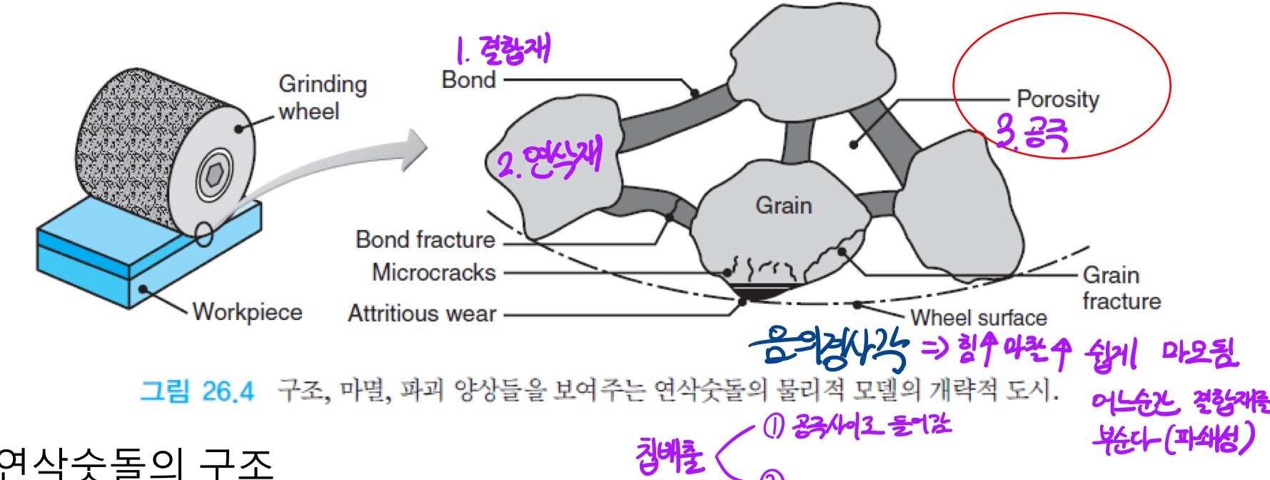 - 접착된 연삭제에서, 칩이 만들어지는데 필요한 공간을 제공하기 위해서 입자 사이에 공극 ( porosity )이 필수적으로 있어야함