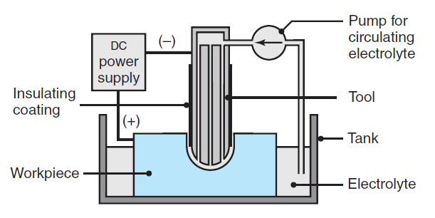 - 전기도금의 역과정으로 전해액이 전류를 운반하며 공구-공작물의 틈( 보통 0.1 ~ 0.6mm )을 유동하면서 전기화학작용으로 공작물을 분해시켜 제거한다.