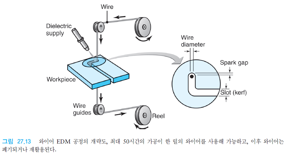 - 방전가공을 응용한 것으로, 천천히 움직이는 와이어가 지정된 경로를 따라가면서 방전 스파크를 톱날처럼 사용하여 공작물을 절단한다.
