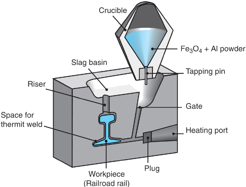 - 이 공정에서는 일반적으로 철산화분말과 알루미늄 분말을 혼합한 후 마그네슘 퓨즈를 점화물로 사용하여 화학반응을 통해 산화알루미늄( AL203 )와 철을 생성하게 된다.