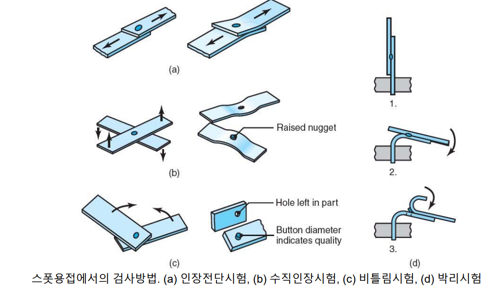스팟 용접부 검사: 전단인장, 십자인장, 비틀림, 필 테스트를 통하여 너깃의 강도를 시험한다.