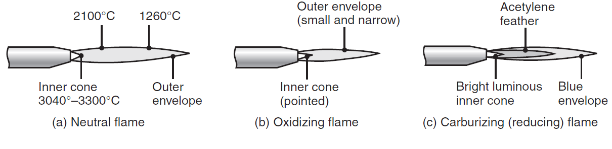 - 산소가 과잉으로 공급이 될 경우 금속을 쉽게 산화시키기 때문에 위험할 수 있다.( 특히 철의 경우 ). 이를 산화염( oxidizingflame )이라고 부른다. 구리 혹은 구리합금의 경우에는 용융된 금속의 표면에 얇은 슬래그 보호막( 산화물 성분 )을 만들어 주기 때문에 산화염이 유리하다.