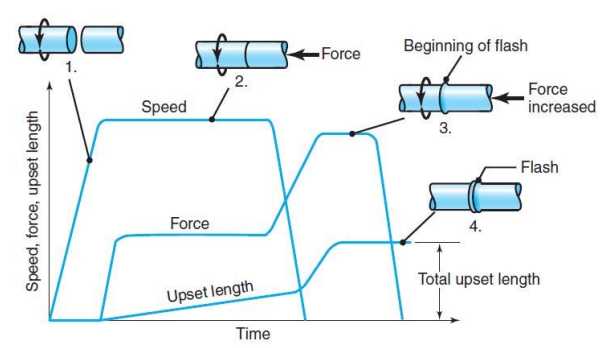 마찰에 필요한 에너지가 플라이 휠에 의해 공급 , 플라이 휠이 멈추면 용접이 완성 ( 운동E 사용 )