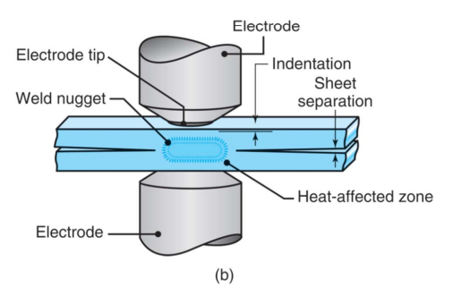 원통형 전극을 두 금속 박판의 겹침접합부에 접촉하여 저항열로 너깃 형태의 용접부 형성