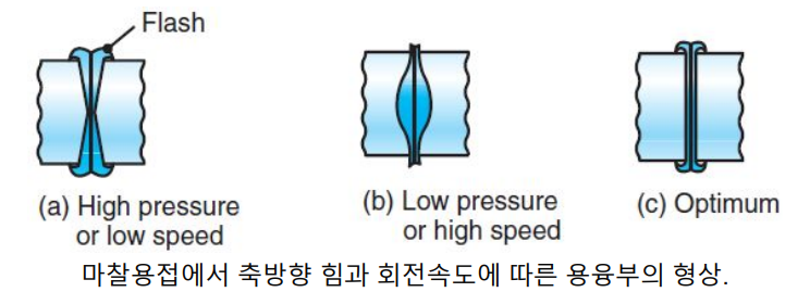 - 용접특성은 발생된 열량, 재료의 열전도성, 고온에서의 피용접불의 기계적 성질, 회전속도, 축 방향 압력에 의해 결정