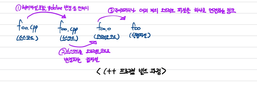 C++ 소스 코드( 흔히 부르는 코드 )를 컴퓨터가 이해할 수 있는 코드로 변경하는 과정을 말한다.